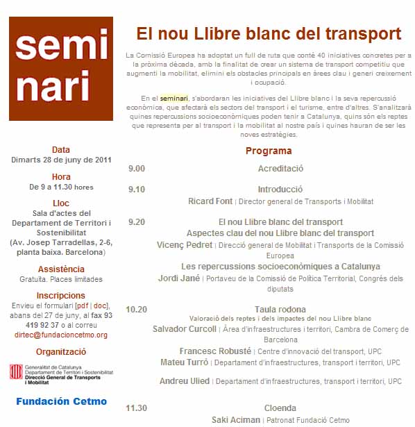 El dia 28 de juny de 2011 s’ha organitzat el seminari sobre El nou Llibre blanc del transport, publicat per la Comissió Europea, a càrrec de la Fundació Cetmo, a la seu del Departament de Territori i Sostenibilitat de la Generalitat de Catalunya.