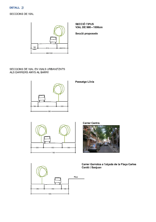 – Seccions de vial tipus. Ample de calçada per a la circulació: 510 cmpels carrers de 10 m, i 550-530 cmpels carrers de 12 o més metres. Ample de vorera mínim en carrers de 10 mde 180 cm. VEURE DETALL 3, on es mostren seccions de vial d’obres recents amb una calçada per la circulació de 260, 290 i310 cm amb aparcament a un costat com a mínim.