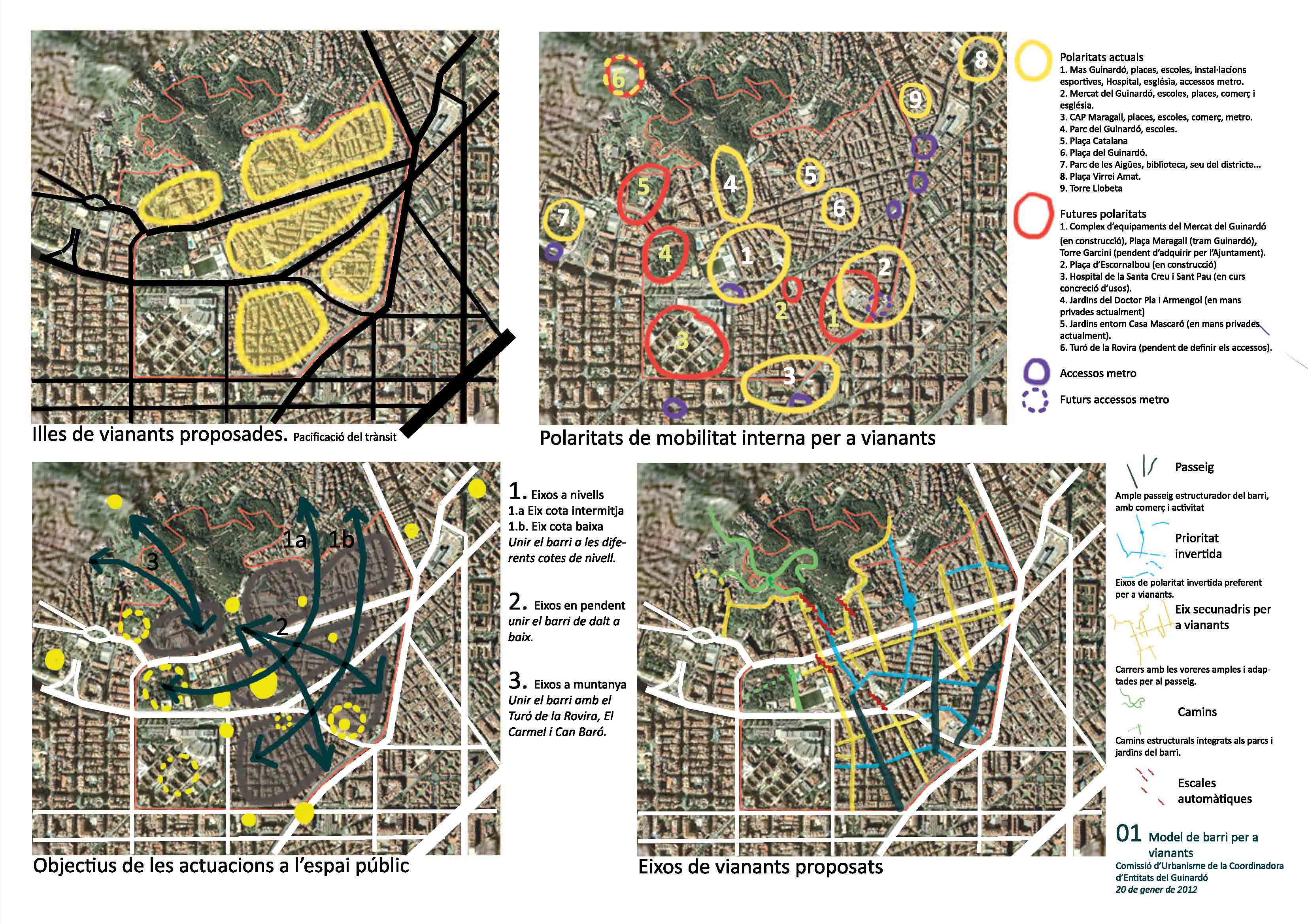 - Definició d’itineraris per a vianants que articulin l’interior del barri. Estructuració del barri i de les principals polaritats d’activitat del barri, el complex d’equipaments (en construcció) del Mercat del Guinardó, el Mas Guinardó i el Parc del Guinardó.
