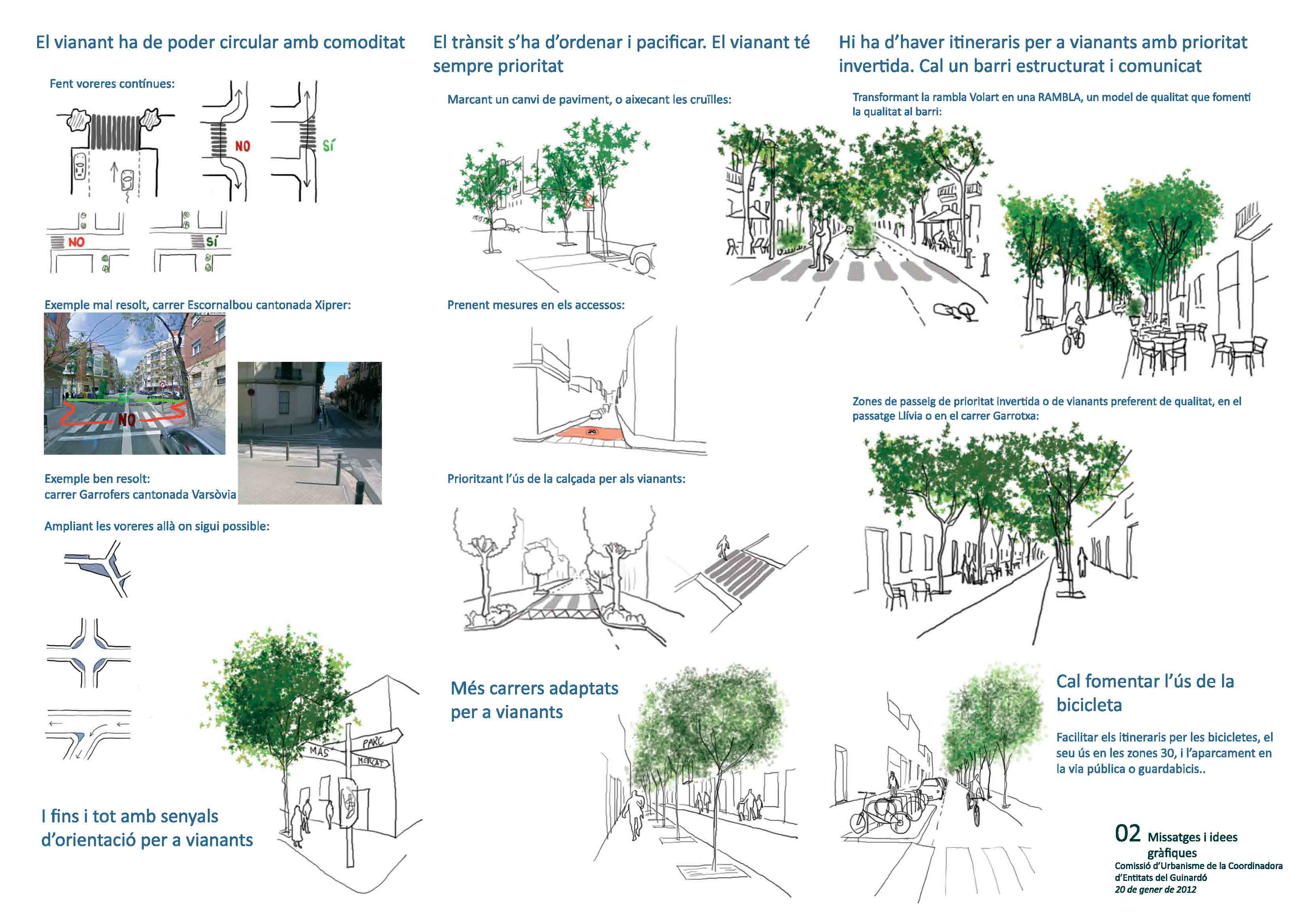 - Vorera contínua a totes les cruïlles que garanteixin la pacificació del trànsit, la circulació de vianants preferent, i que millori la visibilitat, seguretat i accessibilitat.