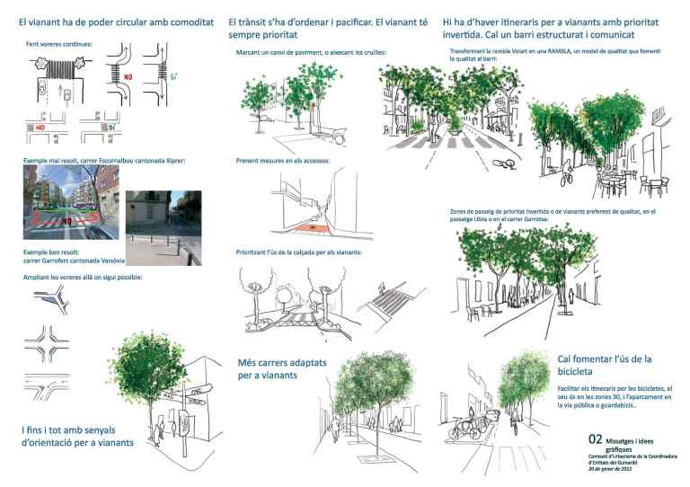- Habilitar l’espai públic per als vianants, definint àrees de pacificació de trànsit i millorant la visibilitat a les cruïlles.