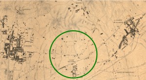 Del plànol anterior en ressalta l’eix de l’actual Rambla Volart i la seva continuïtat sobre l’actual carrer Bisbal. També s’observa l’actual camí del Torrent d’en Melis, entre Can Planàs (Actual Centre Cívic), i la Casa Ravetllat Pla. Aquestes dues traces són les més antigues del barri, juntament amb la traça del carrer Garrotxa, tal i com més endavant s’exposa.