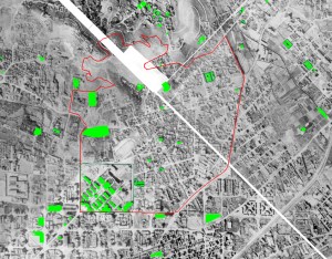 Plànol indicatiu dels elements patrimonials protegits urbanísticament en l’actualitat, sobre la base de l’ortofotoplànol de 1947.