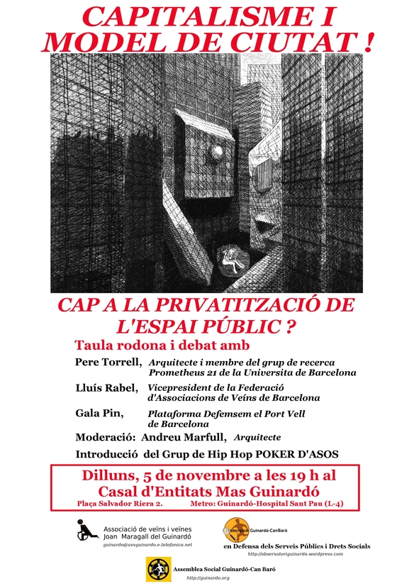 El proper dilluns 5 de novembre presento i modero la xerrada titulada ‘Capitalisme i model de ciutat’, que tindrà lloc a les 19:00 al Casal d’Entitats Mas Guinardó. La iniciativa ha estat organitzada per entitats veïnals del Guinardó i de Can Baró, l’Associacio de veïns i veïnes Joan Maragall del Guinardó i l’Observatori Guinardó-Can Baró, un grup de treball de l’Assemblea Social Guinardó-Can Baró. Comptarà amb els ponents Pere Torrell (arquitecte i membre del grup de recerca Prometheus 21 vinculat a la Universitat de Barcelona), en Lluís Rabell (Vicepresident de la Federació d’Associacions de Veïns de Barcelona) i la Gala Pin (Plataforma Defensem Port Vell de Barcelona). El Grup de Hip Hop POKER D’ASOS, tres nois de la Barceloneta, farà la introducció.