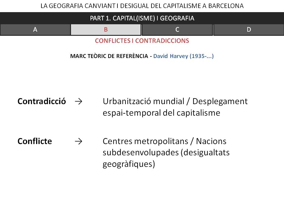 Sota aquest marc conceptual es presenta aquesta ponència amb dues parts principals. Una primera on es mostra una visió -crítica i teòrica- del capitalisme en la seva dimensió econòmica, geogràfica i política; i, una segona on es mostra una visió crítica de la funció pública de l’urbanisme aplicada a un cas que ens és proper, la ciutat de Barcelona i el seu àmbit d’influència. Com a mètode es presenta l’origen i la gènesi de l’actual Ciutat Comtal com el resultat d’uns processos econòmics i financers d’escala cada cop més global, que es contraposen amb una tradició local, amb una herència cultural i un medi que li és propi. La ponència es conclourà amb un torn de debat obert, on compartir punts de vista i opinions.
