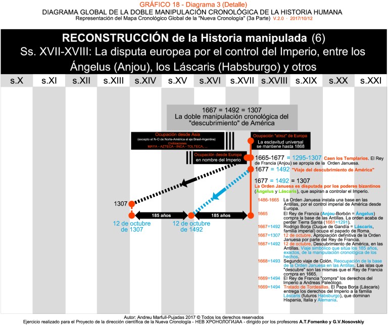 - 1630-1679 = 1445-1494 – El Tratado de Tordesillas: el desafío Láscaris (Habsburgo) a les pretensiones Àngelus (Anjou) por el control de la Orden Januesa, una vez cae Tierra Santa