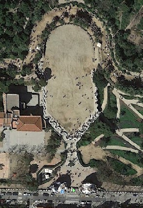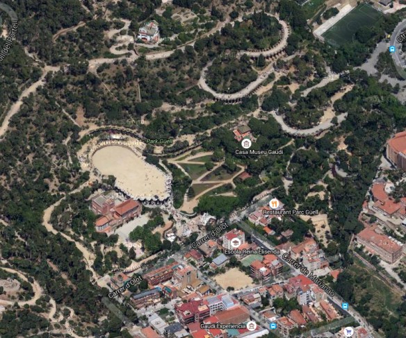 Imatge anterior: Visió zenital del Parc Güell. S’hi mostra una copa que sosté el sol, que té la forma d’un gran cercle al seu capdamunt. Representa el Sant Calze de l’Aliança del Sant Sopar.