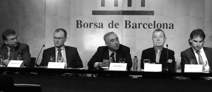 D’esquerra a dreta: Jaume Ventura (Col·lectiu Wilson), Albert Pont (President del CCN), Joan Hortalà (President de la Borsa de Barcelona), Modest Guinjoan (PIMEC i professor a la Universitat Pompeu Fabra) i Jordi Cuixart (empresari i tresorer a ÒMNIUM). Fotografia: Jordi Rosset, tresorer del CCN.