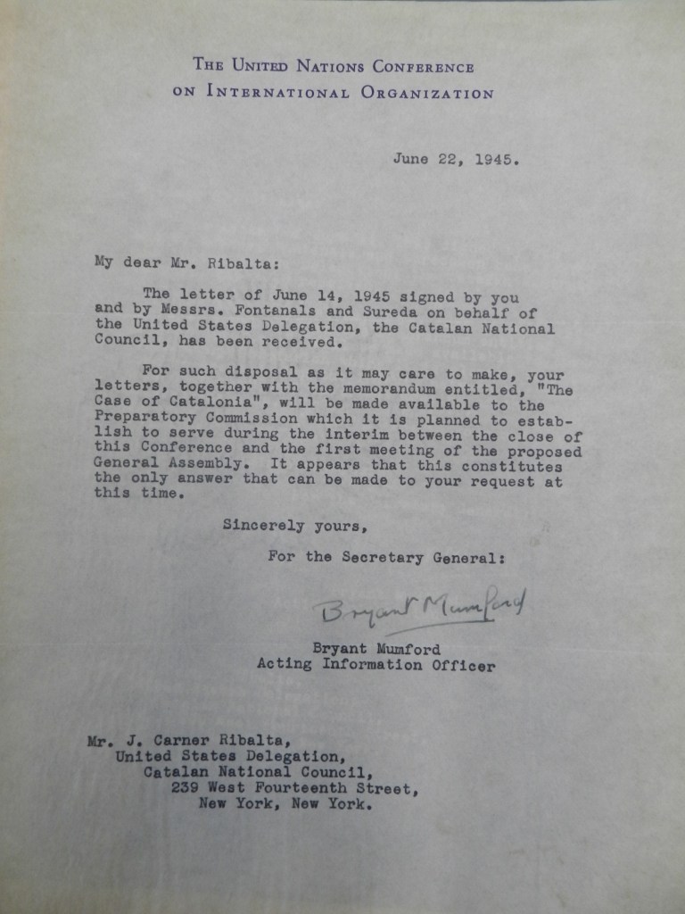 Ens referim a la vostra carta del 16 de maig, pel que fa a la nostra apel·lació a les Nacions Unides en nom de Catalunya i a la nostra sol·licitud que es concedeixi permís a aquesta delegació per presentar el memoràndum “El cas de Catalunya” a la Conferència de les Nacions Unides.