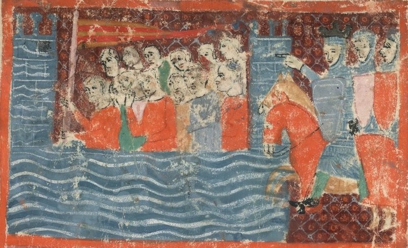 Escena de l’èxode, amb Moisès liderant el poble d’Israel, creuant el mar, que dibuixa dues torres, com les d’Hèrcules. A la dreta, els exèrcits que els segueixen, que no semblen el Faraó. Detall de la “Sister Haggadah”, original de Barcelona. Autor desconegut. Font: The British Library, Or. 2884, f 16v (domini públic).