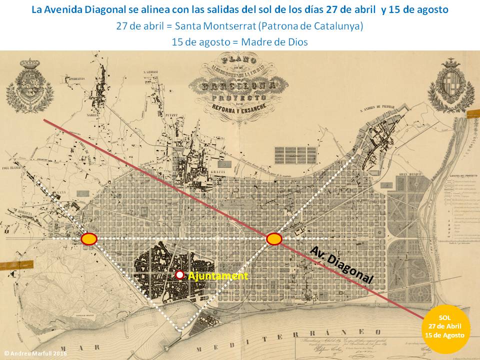 La avenida Diagonal responde a otro motivo. Pasa por el centro del plano del Eixample (Glòries) pero recibe su orientación de la salida del sol. El punto en el que sale el sol los días 27 de abril y 15 de agosto de cada año, visto desde el centro de las Glòries, traza la avenida Diagonal. Se trata de una alegoría entre la Moreneta (Santa Montserrat, 27 de abril) y la Virgen María (15 de agosto). Indirectamente, hace referencia a la Magdalena catalano-provenzal.