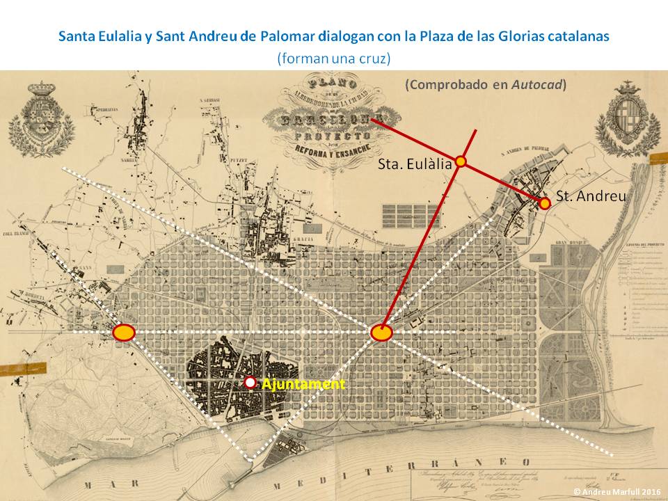 Los puntos de las Glòries, Santa Eulàlia y Sant Andreu trazan un rectángulo, como un cartabón, y se dibuja una cruz que les une.