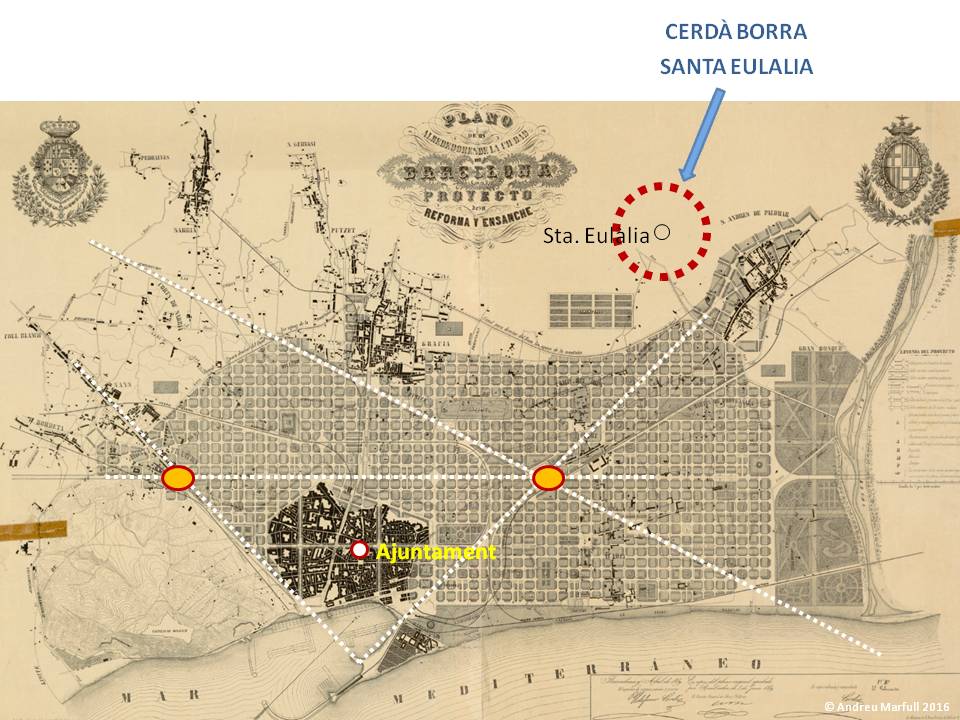 Curiosamente (o no), Cerdà borra del plano del Eixample toda traza de Santa Eulàlia, a pesar de mostrar otros núcleos alejados como Sant Gervasi y Sarrià.