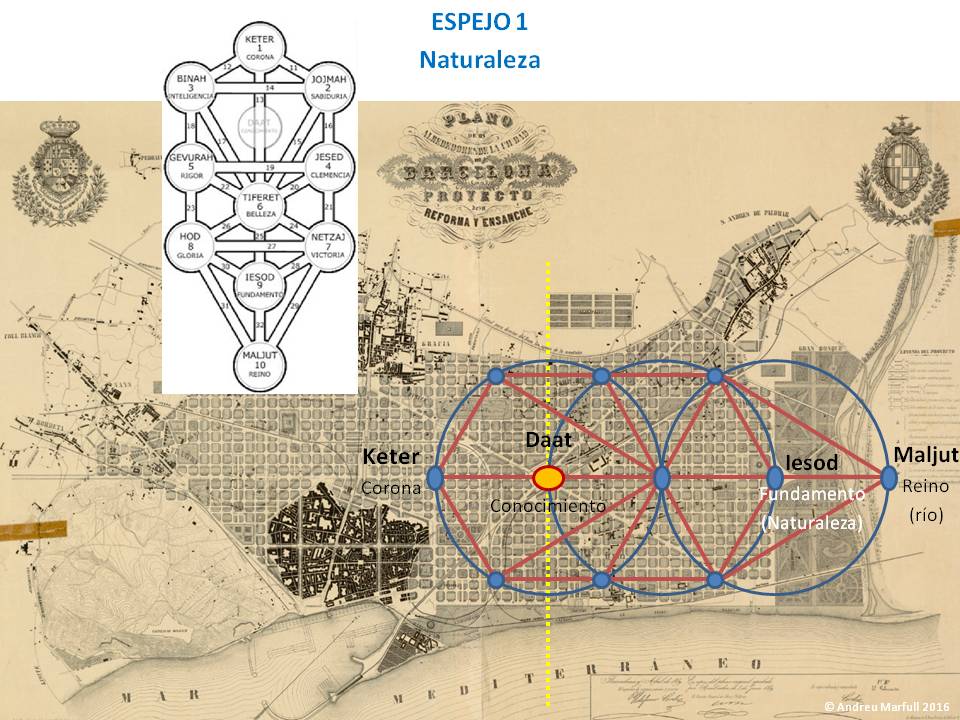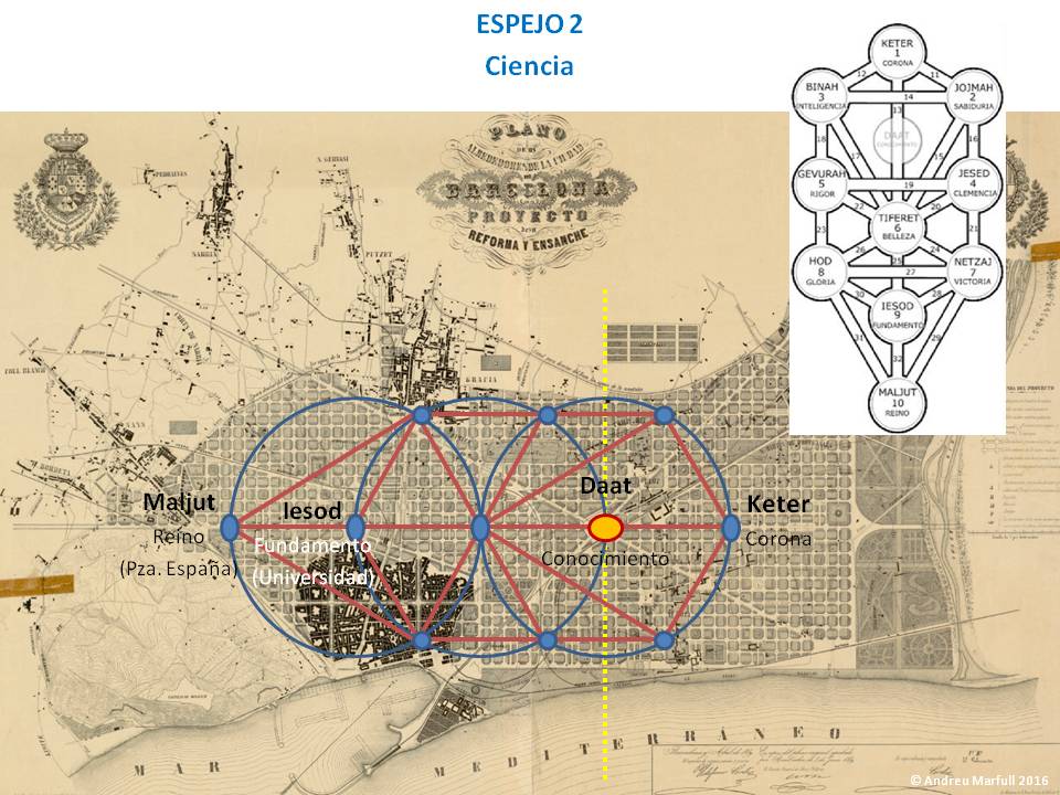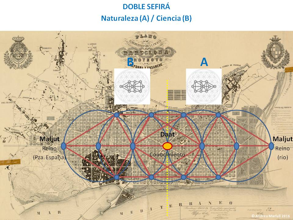 Hechas estas líneas maestras, Ildefons Cerdà habría utilizado la cuadrícula del Eixample para realizar una geometría que ocultaría la Sefirá cabalística judía, pero (según esta reconstrucción) no de la forma que transcriben Hernàndez y Pongiluppi (en 2015). En el tramo dirección al río Besòs (a la derecha de las imágenes) se habría insertado una Sefirá “metafísica”, y en el tramo dirección Llobregat (a la izquierda) otra “física. Ambas Sefirá coincidirían con el punto interior conocido como Daat (Conocimiento), que se encontraría en la plaza de las Glòries. De este modo, en el tramo Besòs la emanación divina del Iesod (Fundamento) coincide con la “puerta” en el “Gran Bosque” que diseña Cerdà, y representa la Naturaleza (la Creación de Dios), y en el tramo Llobregat el Iesod (Fundamento) coincide con la puerta de la Universidad de Barcelona, que tiene origen en fechas contemporáneas a la creación del Plan Cerdà, y representa al Logos (la creación de la conciencia). El Plan se ultima en 1859 y la Universidad empieza a construirse en 1863, así que se trata de hechos encadenados.
