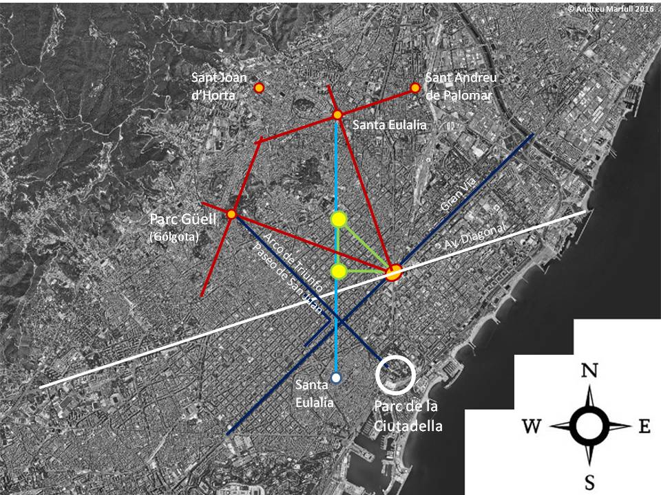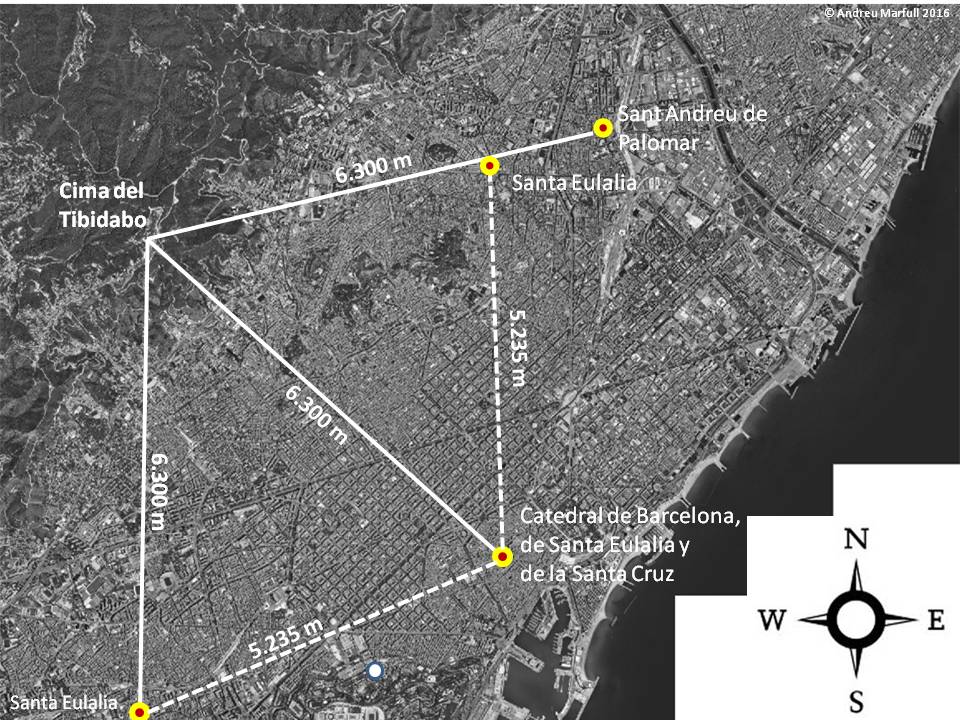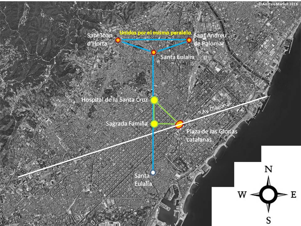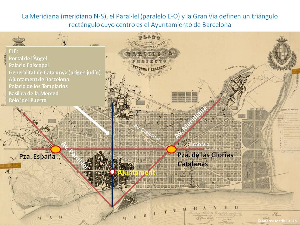 En primer lugar, resaltar que la Gran Via de les Corts Catalanes, la avenida Meridiana (es la traza de un meridiano, Norte-Sur) y la avenida del Paral·lel (es la traza de un paralelo, Este- Oeste) crean un triángulo rectángulo en el que en el centro geométrico se encuentra el Ayuntamiento de Barcelona. Las avenidas marcan el punto del reloj del Puerto de Barcelona y su bisectriz contiene (de mar a montaña): la Basílica de la Merced, el antiguo palacio de la Orden del Templo de Salomón, el Ayuntamiento, el Palacio de la Generalitat (antiguo palacio judío) y el Palacio Episcopal, para continuar por el Portal del Ángel y conducir a la iglesia de Santa Ana, la sede española de la Orden del Santo Sepulcro (creado con motivo de la primera cruzada en Jerusalén). Equidistantes se encuentran las plazas de las Glòries Catalanes y de España.