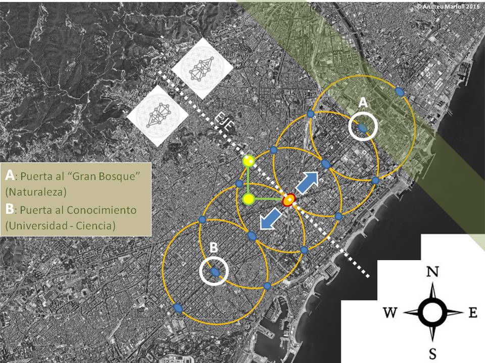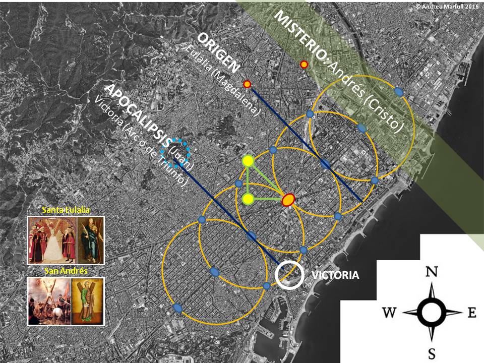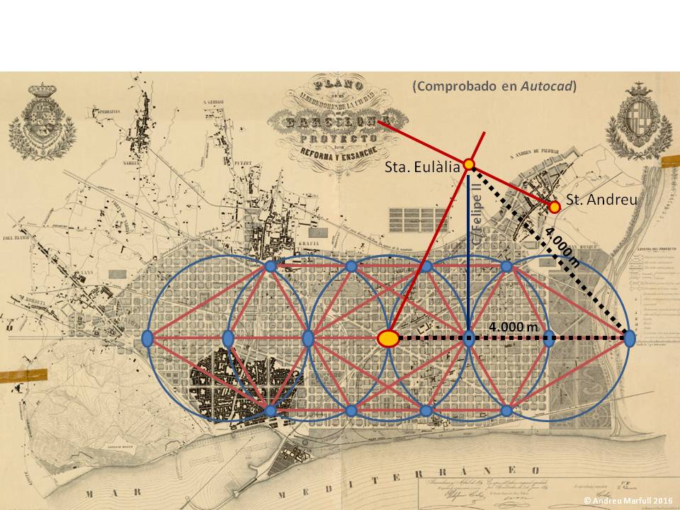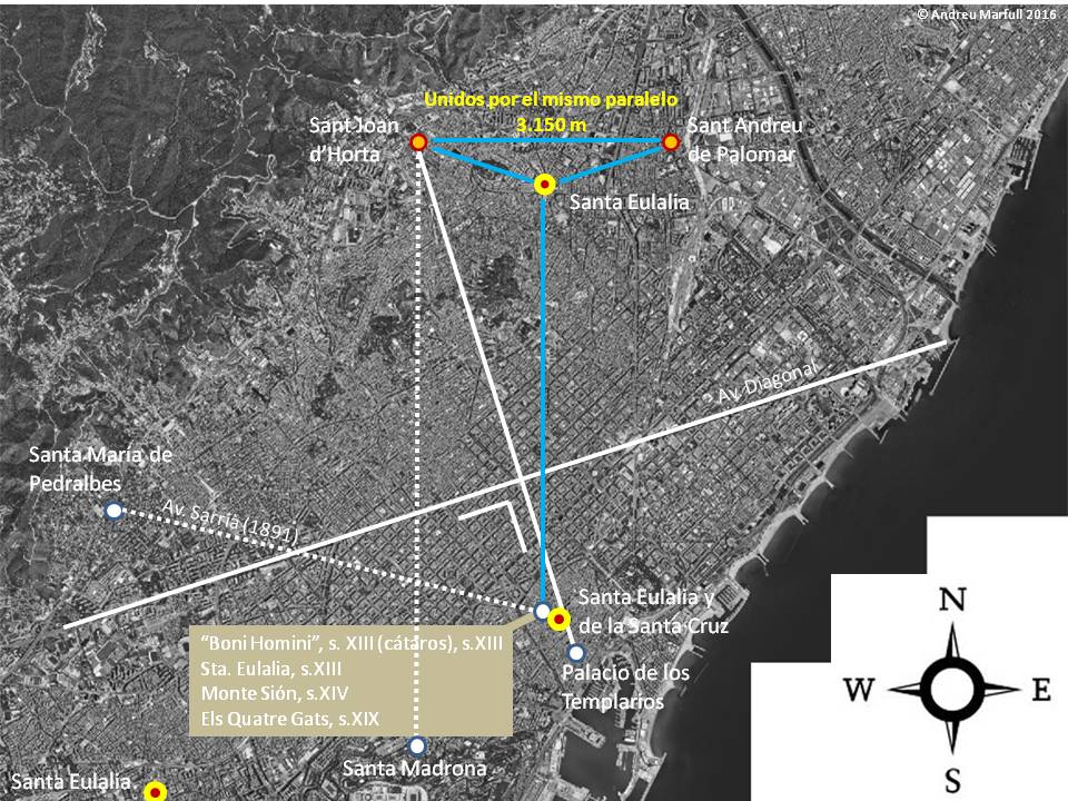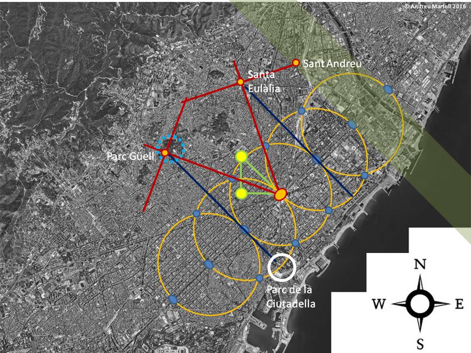 En primer lugar, resaltar que la Gran Via de les Corts Catalanes, la avenida Meridiana (es la traza de un meridiano, Norte-Sur) y la avenida del Paral·lel (es la traza de un paralelo, Este- Oeste) crean un triángulo rectángulo en el que en el centro geométrico se encuentra el Ayuntamiento de Barcelona. Las avenidas marcan el punto del reloj del Puerto de Barcelona y su bisectriz contiene (de mar a montaña): la Basílica de la Merced, el antiguo palacio de la Orden del Templo de Salomón, el Ayuntamiento, el Palacio de la Generalitat (antiguo palacio judío) y el Palacio Episcopal, para continuar por el Portal del Ángel y conducir a la iglesia de Santa Ana, la sede española de la Orden del Santo Sepulcro (creado con motivo de la primera cruzada en Jerusalén). Equidistantes se encuentran las plazas de las Glòries Catalanes y de España.