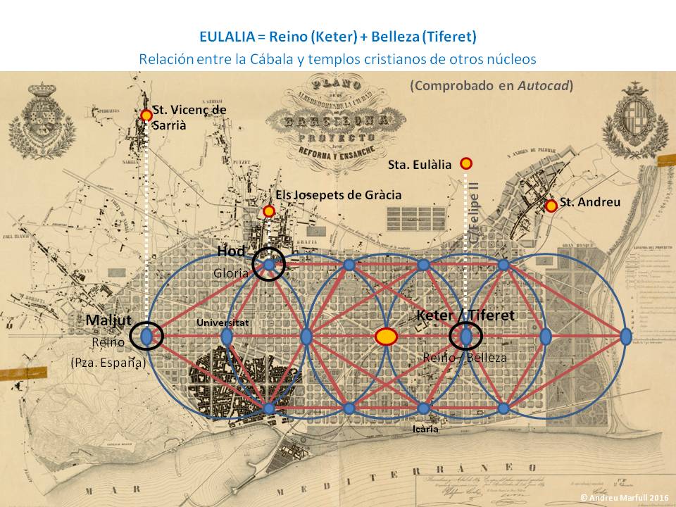Asimismo, una singular relación aparece entre esta geometría y Santa Eulalia. Desde el Maljut (Reino) existe la cifra exacta de 4.000 metros, trazando así lo que parece la forma de un compás. Existe una curiosa geometría en el Eixample de Cerdà: tres bloques de 10 manzanas miden 4 kilómetros exactos, de modo que 4.000 metros divididos por 30 ejes miden 133,3 metros, que es el tamaño entre ejes de la retícula del Eixample. En este encaje, Eulalia se encuentra sobre el eje de la emanación Tiferet (Belleza), que se une por la actual calle de Felipe II en la Sefirá metafísica, mientras que respecto a la Sefirá física coincide con el Keter (Corona). La Corona y la Belleza son señales de Santa Eulalia, como también lo son de la Virgen María y de la Magdalena.