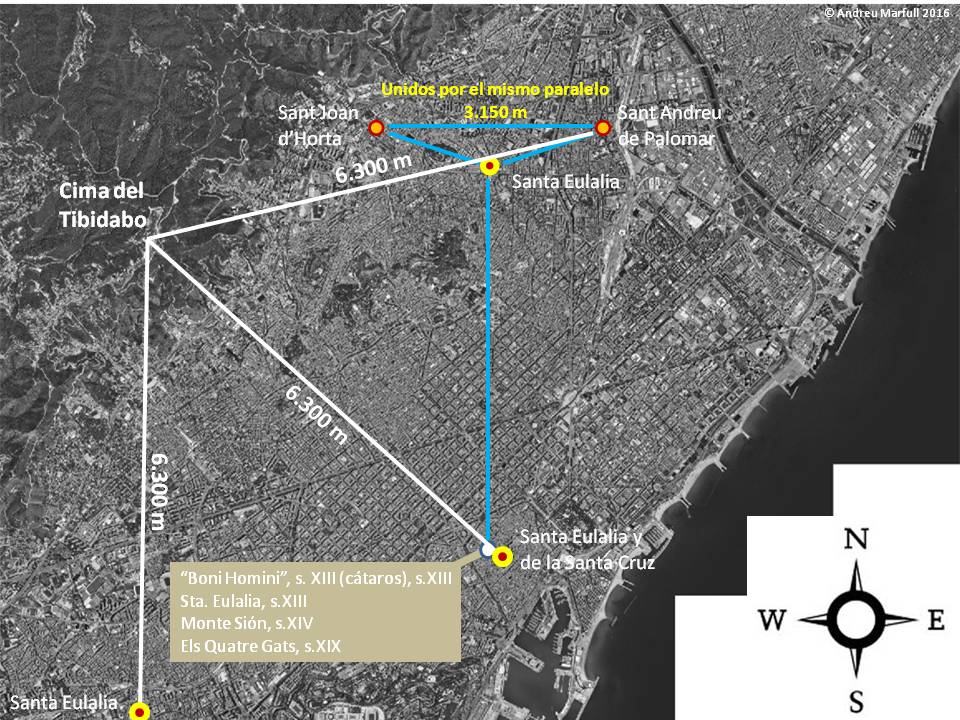 Sant Joan y Sant Andreu se encuentran a la misma distancia de Santa Eulalia (de Vilapiscina), y ésta apunta a un lugar singular, en dirección Norte-Sur. Apunta a los terrenos del antiguo monasterio de los cátaros de Barcelona, de los “Boni Homini”, que después fue la sede de las monjas de Santa Eulalia, para serlo después de las dominicas de Mont-Sió (Monte Sión), hasta que en el siglo XIX se derriba todo y se hace un edificio neoclásico donde se ubica el famoso café de los “Quatre Gats” (“gats” significa “gatos”), donde personajes como pablo Picasso se reunían para socializar intelectualmente.