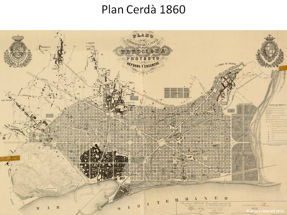 Llegado a este punto podemos empezar con el análisis del Plan del Eixample de Ildefons Cerdà, de 1859, publicado en 1860. Todo él se adapta a la geometría anterior.
