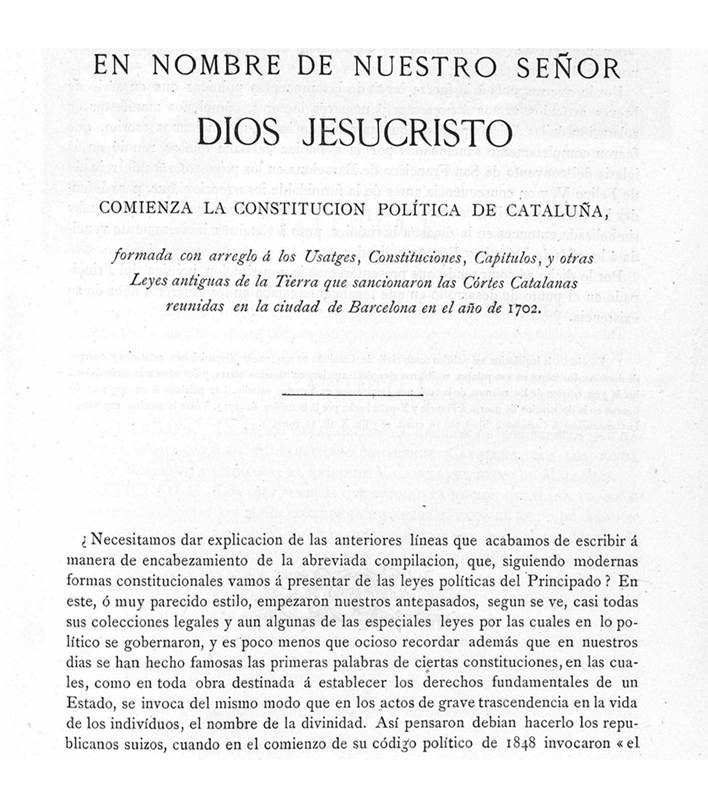A la lletra petita es justifica la referència a Crist, remetent-se a documents legals d’altres indrets, com França els anys 1791, 1793 i 1795, Brasil el 1824, Nova York (no posa data), Grècia el 1864 i la Constitució espanyola de l’any 1812. Altrament, és com apareix a la compilació de les Constitucions de 1704.