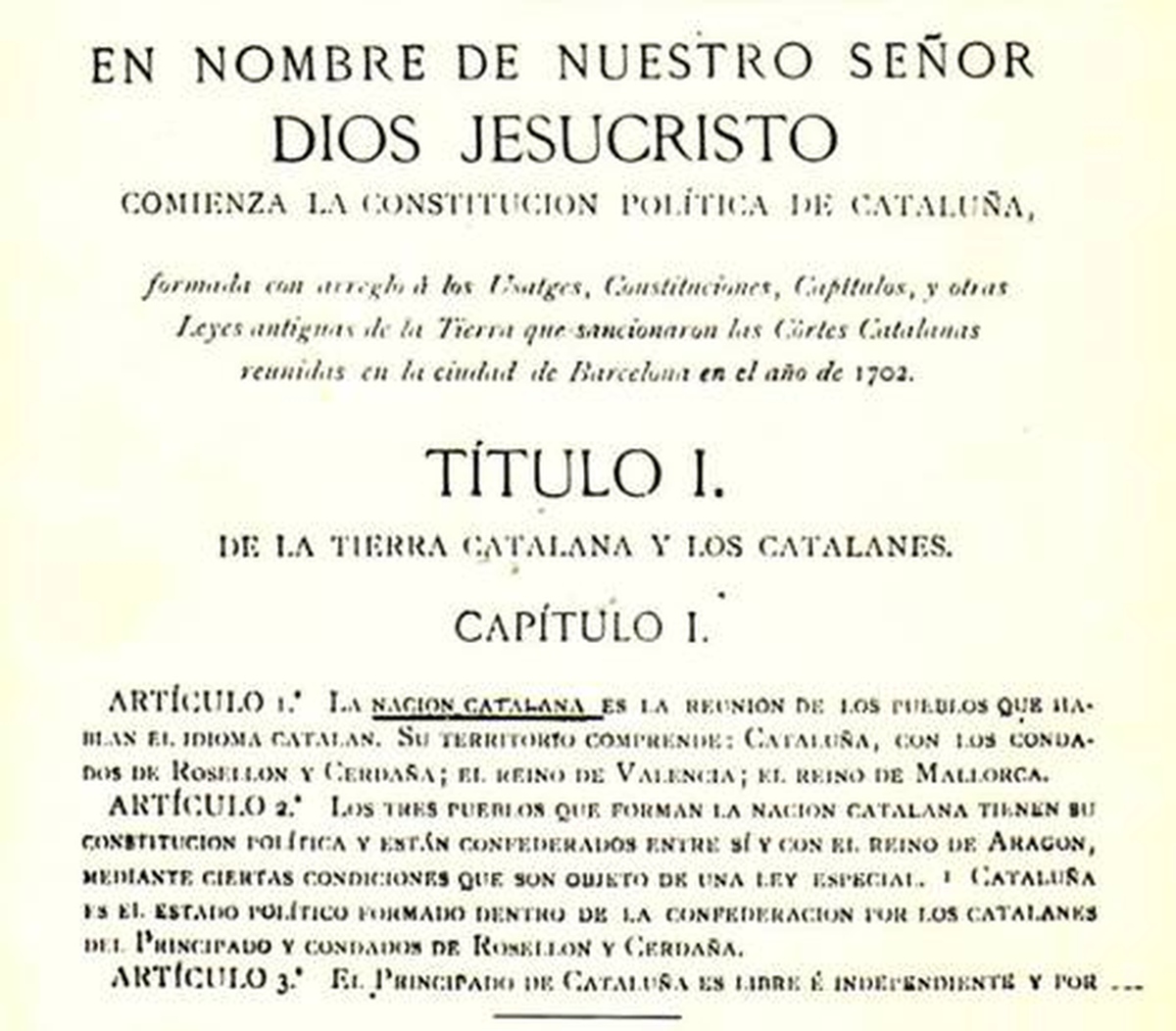 La imatge anterior dona a entendre que, l’any 1702, el rei Felip V va constituir la nació catalana, fent-la lliure, integrant-la als països que avui diem catalans, aleshores els regnes de València i Mallorca, més el Rosselló i el conjunt de terres de parla catalana que, de fet, ja formaven part de França. I molts li han donat credibilitat, però en realitat es tracta d’un muntatge composat entre dos textos, d’un llibre publicat l’any 1878 titulat “Los fueros de Cataluña”, escrit per en Josep Coroleu i en Josep Pella i Forgas, que tenia la intenció de construir un cos estructurat del dret català, des de les Constitucions a les institucions polítiques i administratives que la història oficial i l’anàlisi documental té consensuat al segle XIX. Font: https://bvpb.mcu.es/constituciones/en/consulta/registro.do?id=403676
